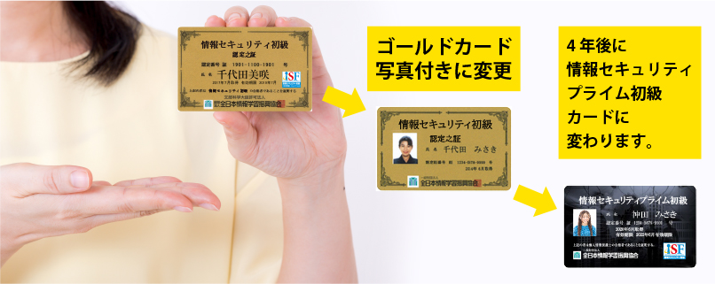 情報セキュリティ初級認定者が、知識や技能を更に高め保持し続けることを目的に、オンラインによる、情報セキュリティの定期講習を1年に1度、2年間受講された方に「更新カード」(2年間有効)を交付しています。