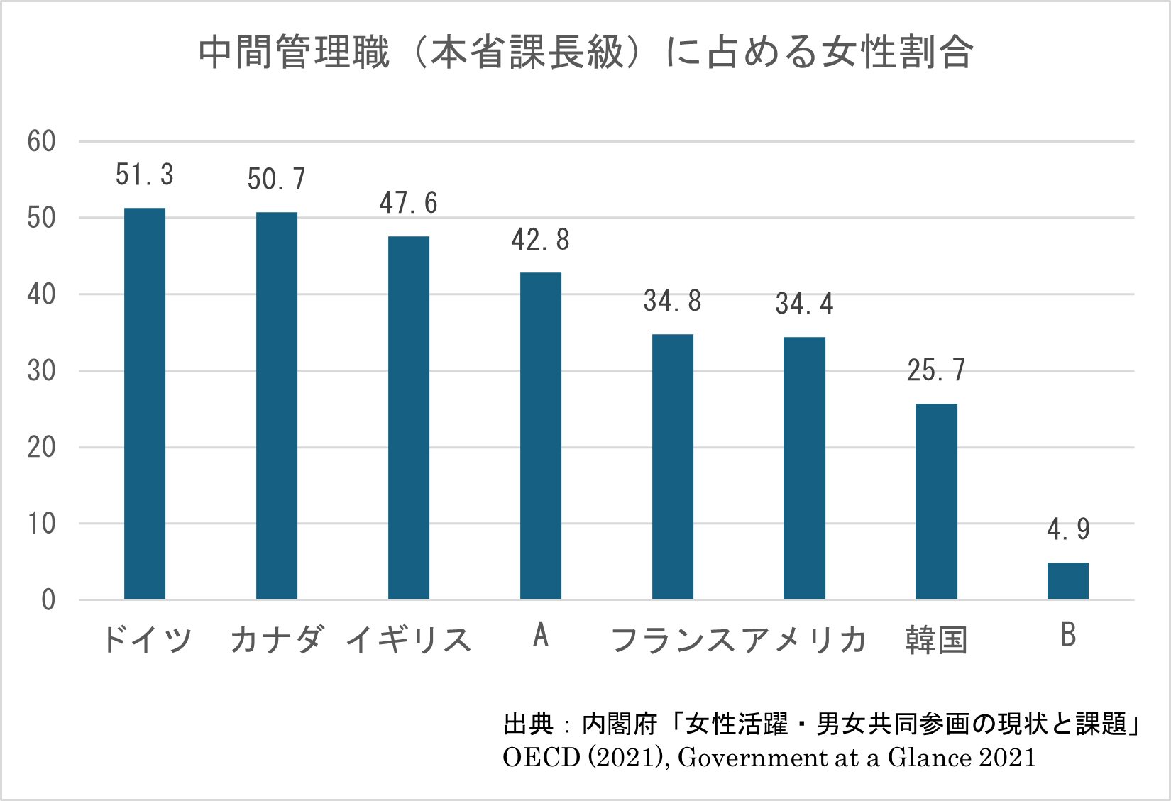 問題5.次の表は、女性国家公務員比率の国際比較を表したものである。この表に関する記述として適切なものを、以下のア・イのうち1つ選びなさい。