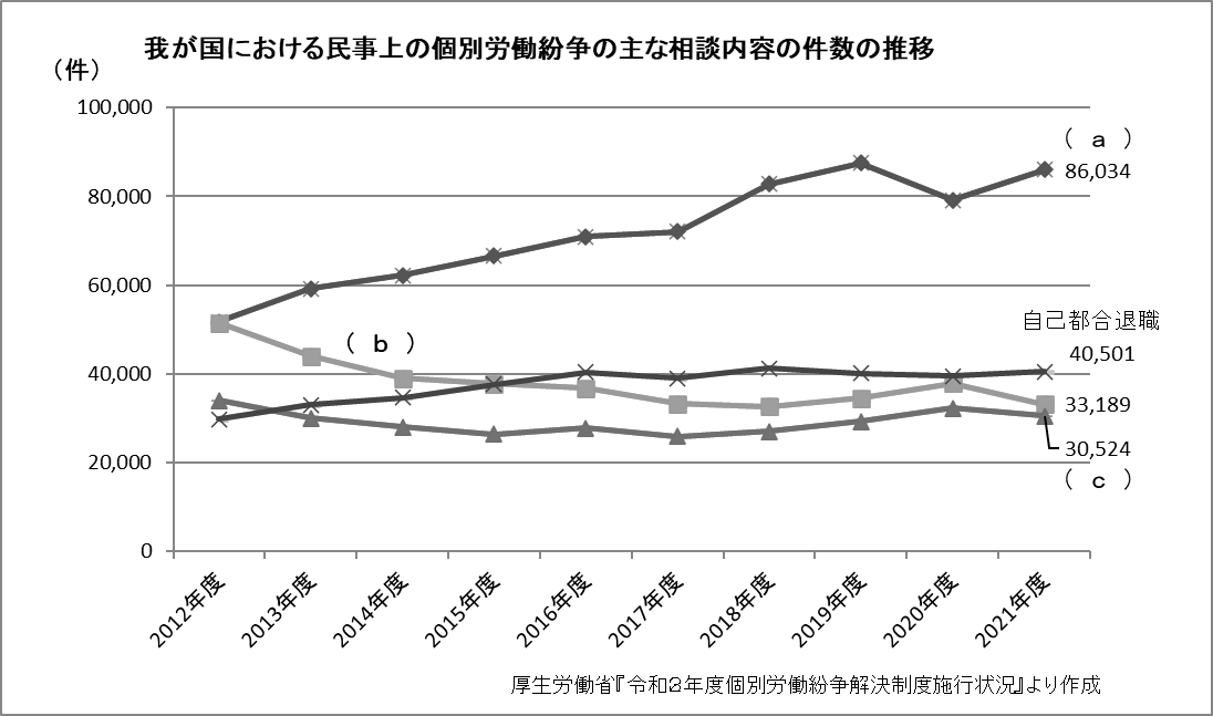 問題4.次の図は、我が国における民事上の個別労働紛争の主な相談内容の件数の推移を示している。図中の( )に入る適切な項目の組合せを、以下のアからエまでのうち1つ選びなさい。