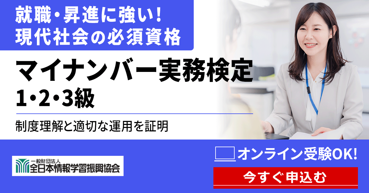 マイナンバー制度の理解と適切な取り扱いを評価する検定試験です。 特定個人情報の保護と適正な運用を目指し、1級から3級までのレベルが設けられています。