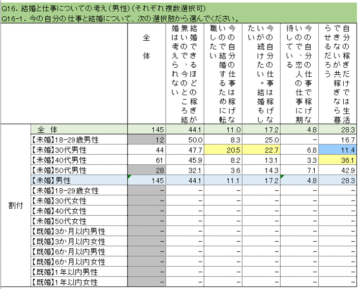 - 次の文章は、未婚の男性145人に「今の自分の仕事と結婚」について調査した結果です。