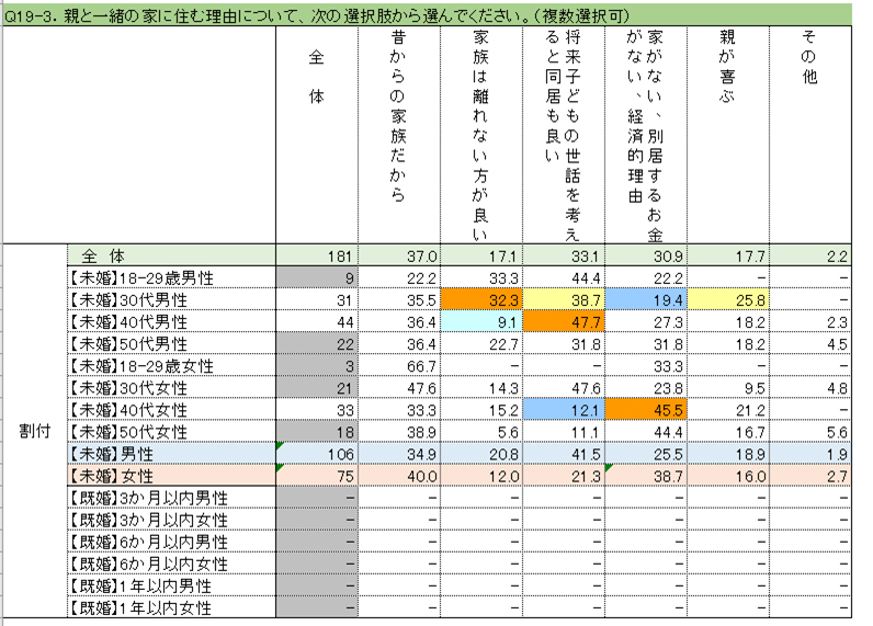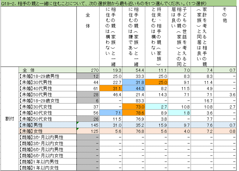しかも内訳を見ると、相手の親と住むのを嫌がっている率は男性の35.2%に対し女性は倍以上の76.8%と、極めて高率でした。許容するのは様々な事情を考えても22.4%と5人に1人です。