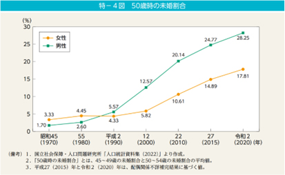 2020年(令和2年)の50歳時の男性の未婚率は( A )%、女性の未婚率は( B )%であった。