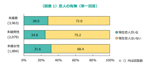 ( A )に聞いたところ、恋人がいる人24.8%、恋人がいない人の率は75.2%で、恋人がいる人は4人に1人しかいなかった。