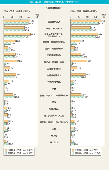 20歳~39歳の男性独身者が、結婚相手に「求める・求めたこと」について見てみると、1位が「価値観が近い」が59.2%、2位は「一緒にいて落ち着ける、気を遣わない」で51.1%、3位が「一緒にいて楽しい」で49.4%である。この3つの項目は、男女とも定番の3条件である。