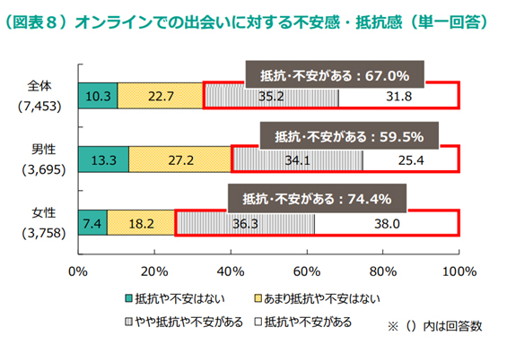 現代のネット社会においては、いわゆる「出会い系サイト」を利用して、男女交際や婚活をする男女も年々増え続けていますが、この「オンラインでの出会い」に抵抗や不安があると答えた人は( A )に及んでいます。