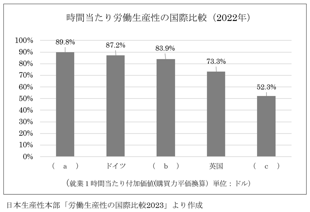 - 次の図は、時間当たり労働生産性の国際比較である。図中の( )に入る適切な国名の組合せを、以下のアからエまでのうち1つ選びなさい。