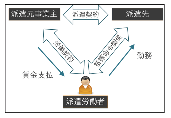 労働者派遣は、労働者が派遣元事業主(人材派遣会社)との間で労働契約を結んだ上で、派遣元事業主が労働者派遣契約を結んでいる派遣先に労働者を派遣し、労働者は派遣先の指揮命令を受けて働くというものであり、労働者に賃金を支払う会社と指揮命令をする会社が異なる。