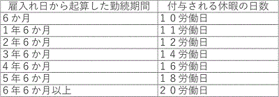 また、最初に年次有給休暇が付与された日から1年を経過した日に、②と同様の要件(最初の年次有給休暇が付与されてから1年間の全労働日の8割以上出勤したこと)を満たせば、11労働日の年次有給休暇が付与される(労働基準法39条2項)。その後同様の要件を満たすことにより、次の表に示す日数が付与される(同項)。