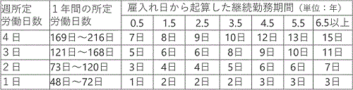 ただし、週所定労働時間が30時間未満で、かつ、週所定労働日数が4日以下、又は1年間の所定労働日数が48日から216日までの労働者については、年次有給休暇は比例的に付与され、具体的には次の表のとおりとなる(労働基準法39条3項)。
